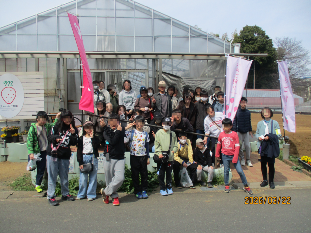 3/22(日)小田急線黒川駅そばのいちご農園で44名の生徒・保護者がいちご狩りを楽しみました。 2026/3/31 ブログ 3/22(日)小田急線黒川駅そばのいちご農園で44名の生徒・保護者がいちご狩りを楽しみました。 11種類の大粒のイチゴで皆さん満足されました。 最高は97粒で完全に元を取りました。 いちご狩り
